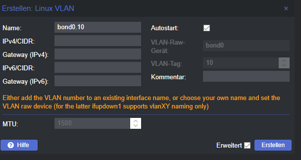 Im zweiten Schritt sind Linux VLANs mit den obgrig angelegten Bonds anzulegen.
