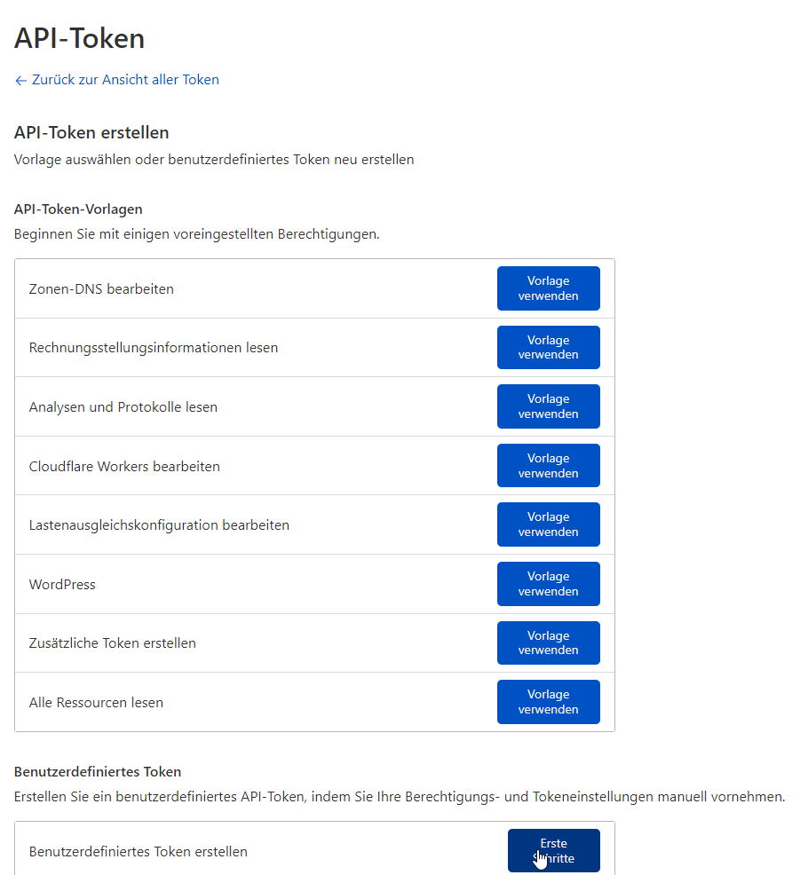 Hier kann ein Cloudflare API Token erstellt werden, welcher zum Bezug des Wildcard Zertifikates via Let´s Encrypt benötigt wird.